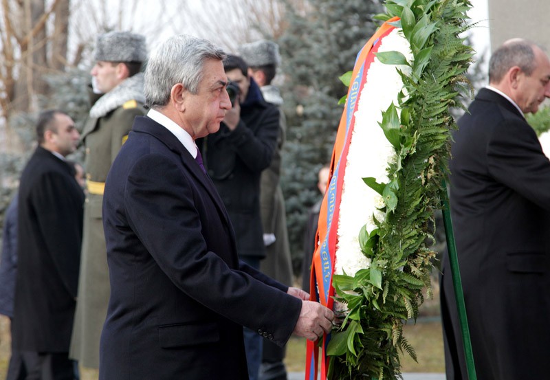 28 Հունվարի, 2012 00:00ՀՀ զինված ուժերի կազմավորման 20-րդ տարեդարձի կապակցությամբ` Հայաստանի Հանրապետության նախագահ, Զինված ուժերի Գերագույն գլխավոր հրամանատար Սերժ Սարգսյանը` Հանրապետության բարձրագույն ղեկավարության, ԼՂՀ նախագահ Բակո Սահակյանի, պաշտպանության նախարար Սեյրան Օհանյանի և Զինված ուժերի ղեկավար կազմի ուղեկցությամբ հունվարի 28-ին այցելել է Եռաբլուր պանթեոն և հարգանքի տուրք մատուցել իրենց կյանքը Հայրենիքի համար զոհաբերած հայորդիների հիշատակին: