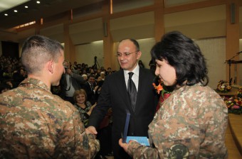 Պաշտպանության նախարար Սեյրան Օհանյանը իր շնորհավորական խոսքում, դիմելով դահլիճում ներկա զինվորների մայրերին, ասել է. «Յուրաքանչյուր մայր անհանգստությամբ ու համբերատարությամբ է սպասում զինվոր որդու վերադարձին. առավել դժվար է այն մայրերի սպասումը, որոնց երկու կամ երեք որդիներն են ծառայում ազգային բանակում: Դադարած, սակայն դեռ չավարտված պատերազմի պայմաններում սահմանում արձակված յուրաքանչյուր կրակոց առաջին հերթին զինվորի մոր հոգում է արձագանքում: Անհանգստանալու հետ մեկտեղ, հպարտացեք Ձեր որդիներով, որովհետև այսօր նրանց շնորհիվ են անառիկ մեր սահմանները»: