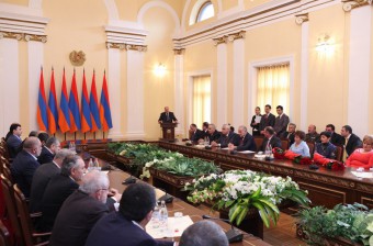 Այսօր այս դահլիճում հյուրընկալելով հայոց բանակի զինվորներին ու նրանց ծնողներին` ես ուզում եմ Ազգային ժողովի ու անձամբ իմ անունից շնորհակալություն հայտնել ձեզ, եւ հանձինս ձեզ` բոլոր զինվորներին ու սպաներին, նրանց ծնողներին ու հարազատներին` բանակին հարազատի հոգատարությամբ վերաբերվելու, բանակի կողքին կանգնած լինելու համար, որովհետեւ որքան էլ խիզախ լինի զինվորը, որքան էլ զինված լինի ամենաժամանակակից զենքով, միեւնույնն է, նա իրեն վստահ չի զգա, եթե թիկունքն ամուր չլինի, եթե չզգա հասարակության աջակցությունը: Իսկ հասարակությունը բոլորս ենք` անկախ մեր զբաղեցրած պաշտոնից: Դրա վկայություն համարենք նաեւ այն, որ Բանակի օրվա առթիվ Ազգային ժողովի պարգեւների են արժանանում ոչ միայն այսօրվա բանակի զինվորի ընտանիքները, այլեւ երեկվա զինվորը, ով այսօր պատգամավոր է, բայց , համոզված եմ, անհրաժեշտության դեպքում արդեն հաջորդ պահին վերստին կզինվորագրվի հայրենիքի պաշտպանությանը»: