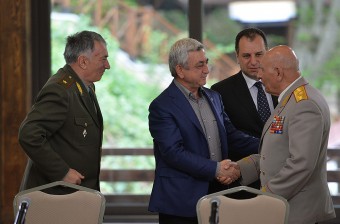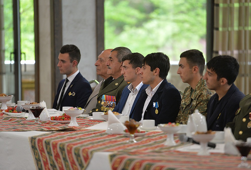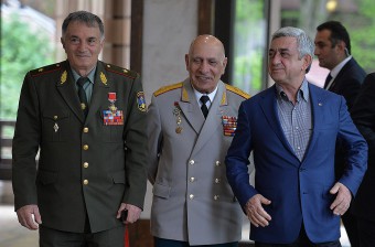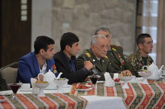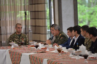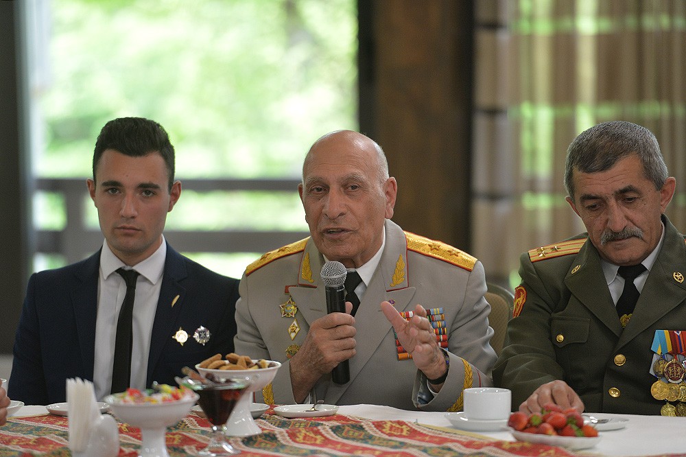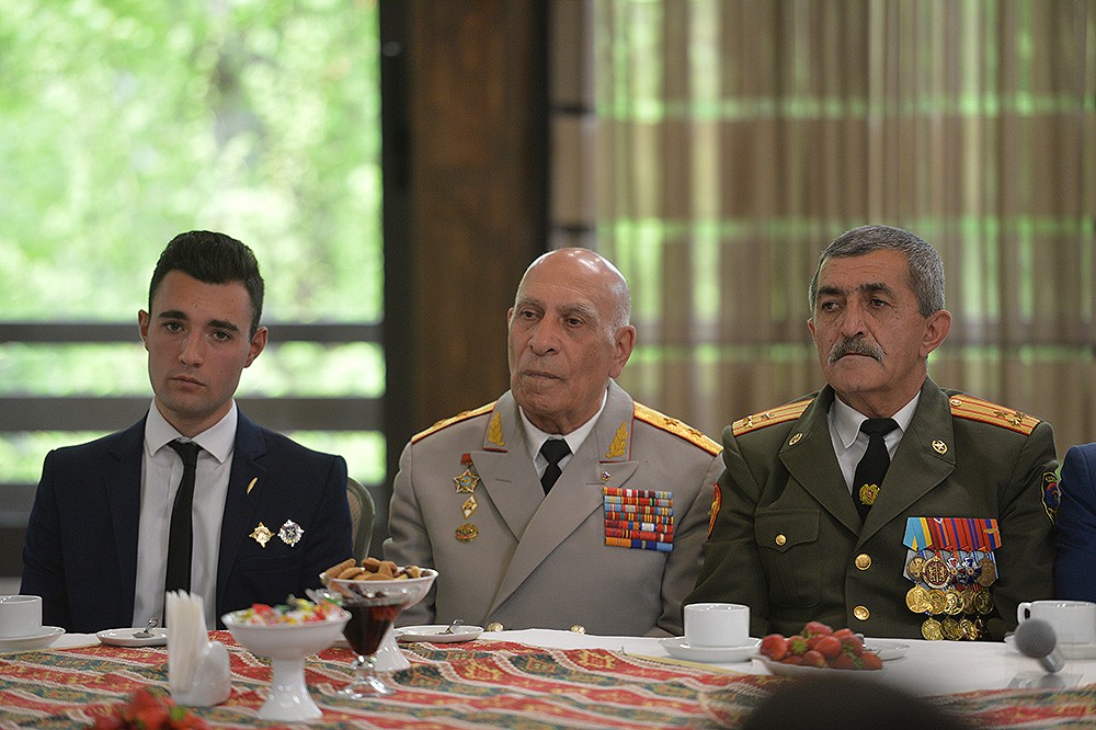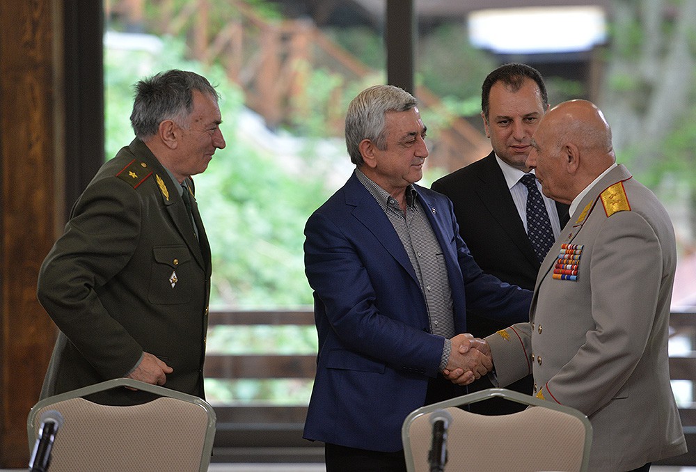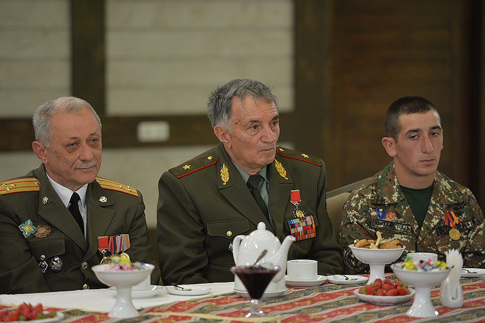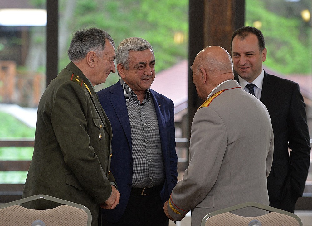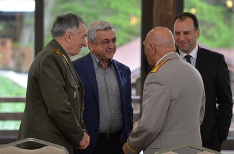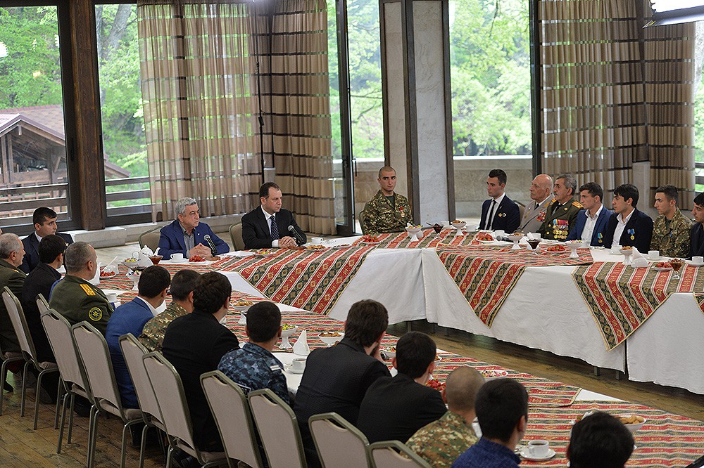 8 Մայիսի, 2017 17:09Աշխատանքային այցով Արցախի Հանրապետությունում գտնվող ՀՀ Նախագահ, Զինված ուժերի գերագույն գլխավոր հրամանատար Սերժ Սարգսյանը մայիսի 8-ին այսօր Շուշիում հանդիպում է ունեցել 2017 թվականին զորացրված, ինչպես նաև ներկայումս ժամկետային զինծառայության մեջ գտնվող և ծառայության ընթացքում անձնվիրության ու խիզախության համար խրախուսման արժանացած մի խումբ զինծառայողների և զորացրված սպաների հետ: Հանդիպմանը մասնակցել են ՀՀ պաշտպանության նախարար Վիգեն Սարգսյանը, ինչպես նաև լեգենդար զինվորականներ` գեներալ լեյտենանտ Նորատ Տեր-Գրիգորյանցը և գեներալ մայոր Արկադի Տեր-Թադևոսյանը, որոնց անցած ուղին օրինակ է ներկայիս զինծառայողների համար: