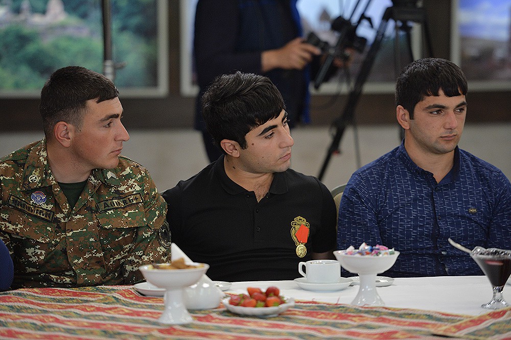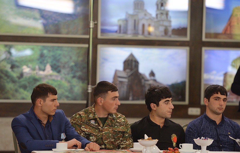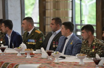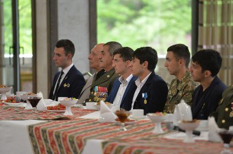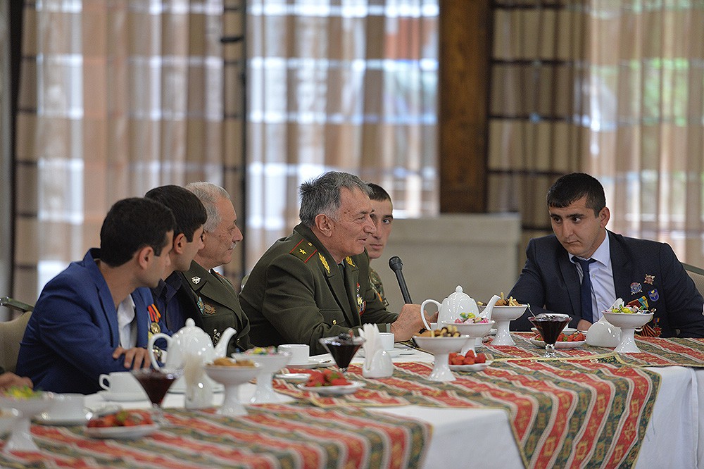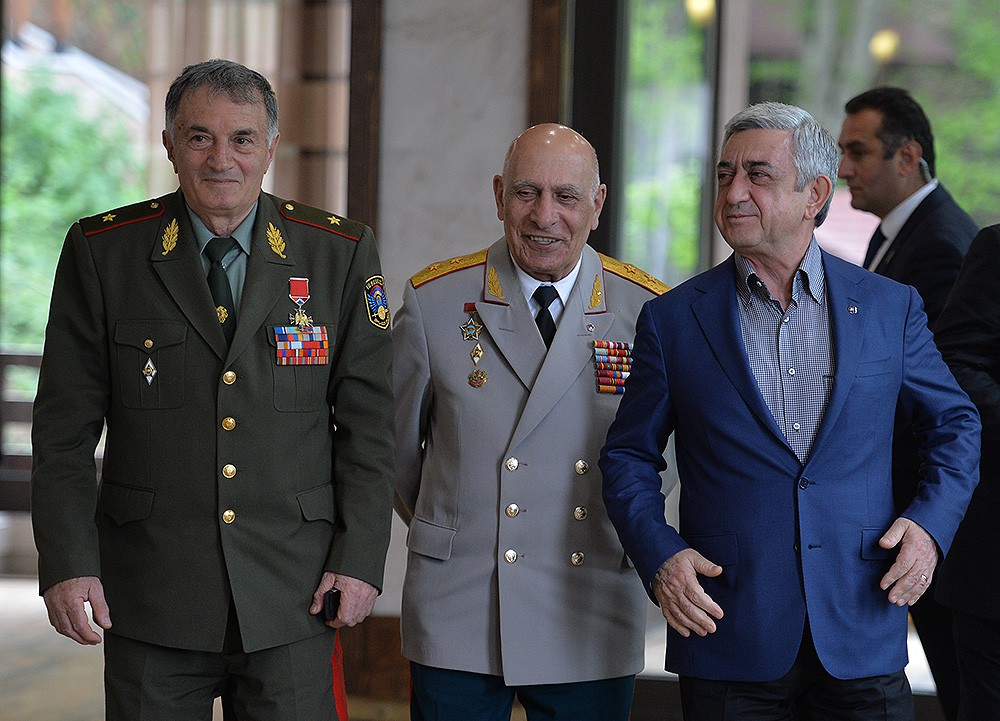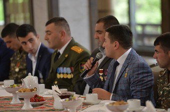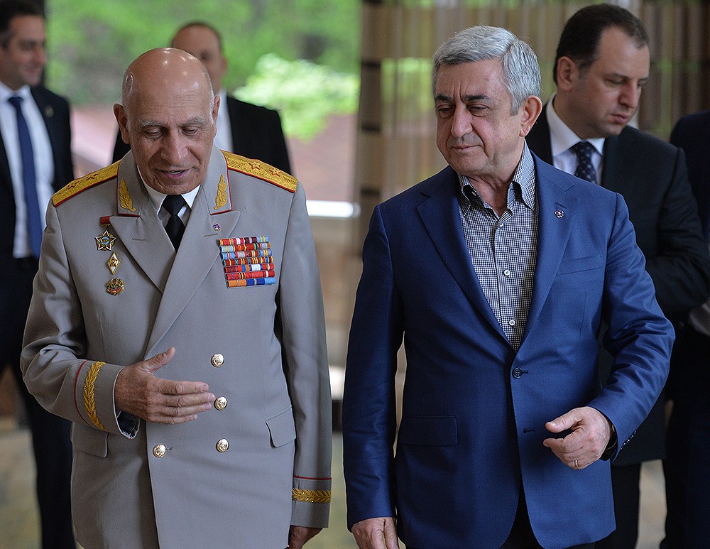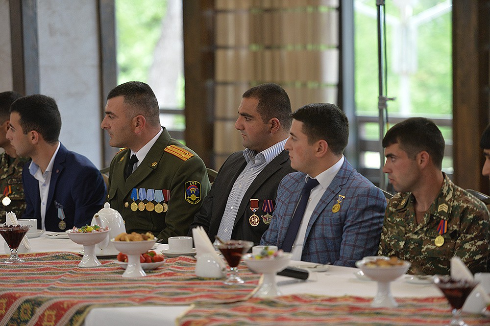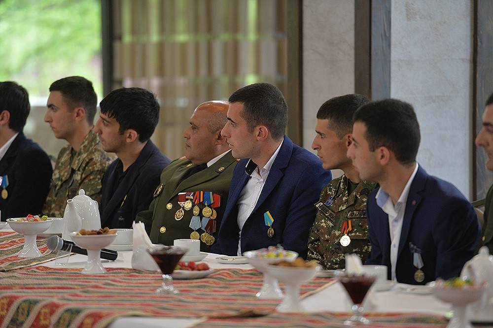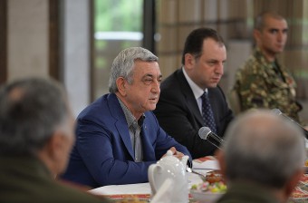 8 Մայիսի, 2017 17:09Աշխատանքային այցով Արցախի Հանրապետությունում գտնվող ՀՀ Նախագահ, Զինված ուժերի գերագույն գլխավոր հրամանատար Սերժ Սարգսյանը մայիսի 8-ին այսօր Շուշիում հանդիպում է ունեցել 2017 թվականին զորացրված, ինչպես նաև ներկայումս ժամկետային զինծառայության մեջ գտնվող և ծառայության ընթացքում անձնվիրության ու խիզախության համար խրախուսման արժանացած մի խումբ զինծառայողների և զորացրված սպաների հետ: Հանդիպմանը մասնակցել են ՀՀ պաշտպանության նախարար Վիգեն Սարգսյանը, ինչպես նաև լեգենդար զինվորականներ` գեներալ լեյտենանտ Նորատ Տեր-Գրիգորյանցը և գեներալ մայոր Արկադի Տեր-Թադևոսյանը, որոնց անցած ուղին օրինակ է ներկայիս զինծառայողների համար: