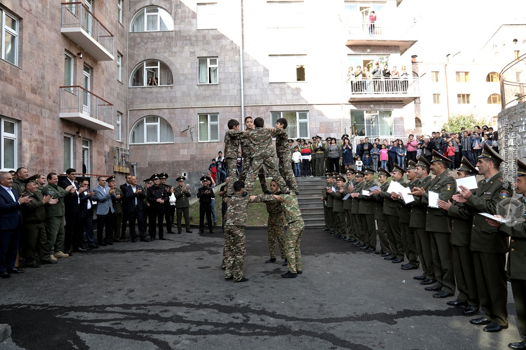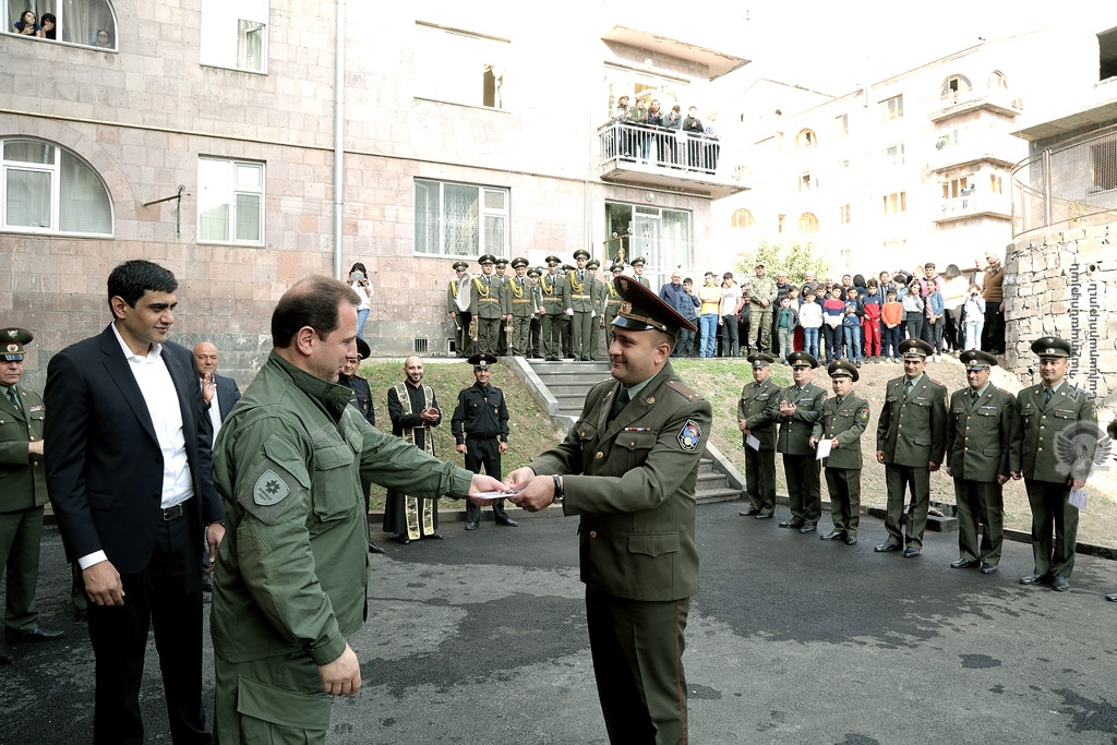 Պաշտպանական գերատեսչության ղեկավարը շնորհավորել է նորակառույց շենքերում բնակարաններ ստացած զինծառայողներին և ընդգծել, որ զինված ուժերի սպայակազմի բնակավորման, սոցիալական ապահովության հարցը մշտապես գտնվում է ՀՀ ռազմաքաղաքական ղեկավարության ուշադրության կենտրոնում: Վստահեցնելով, որ արվում է ամեն հնարավորը զինծառայողների սոցիալական բեռը թեթևացնելու համար, Դավիթ Տոնոյանը համոզմունք է հայտնել, որ բնակարանային խնդրի լուծումը մեծապես կնպաստի զինծառայողների մարտունակության բարձրացմանը և մարտական առաջադրանքների կատարմանը։