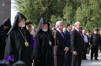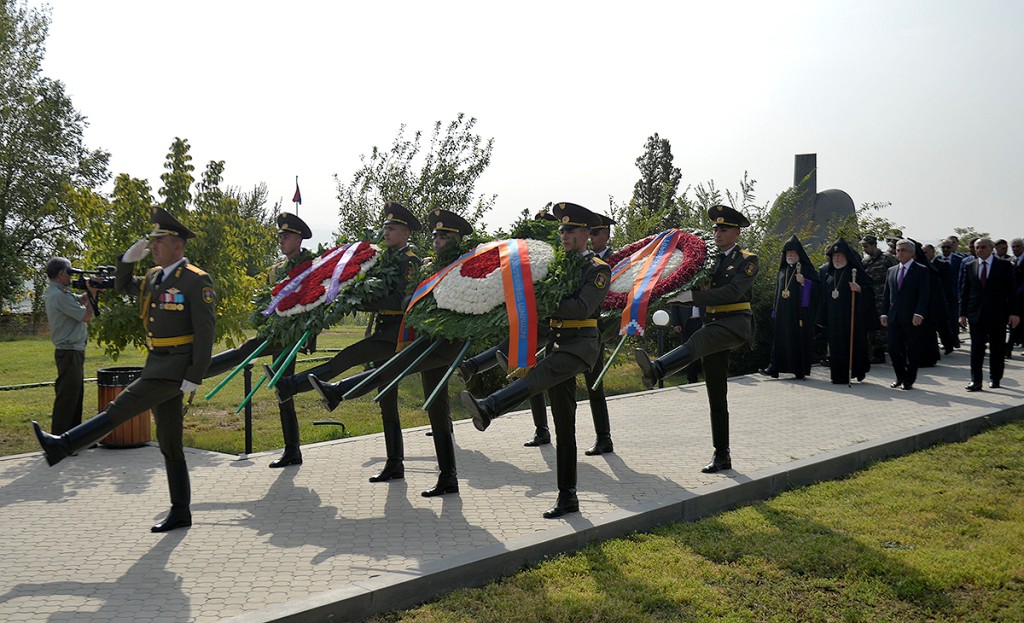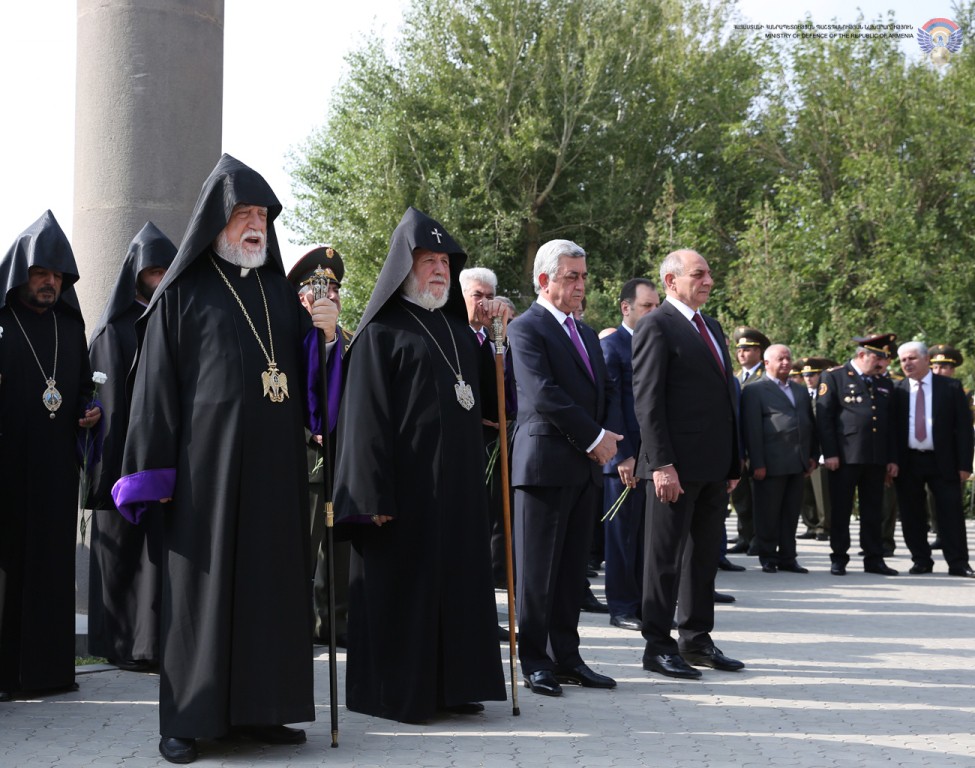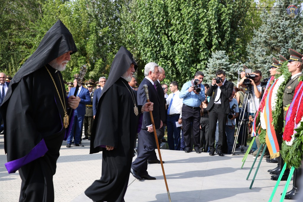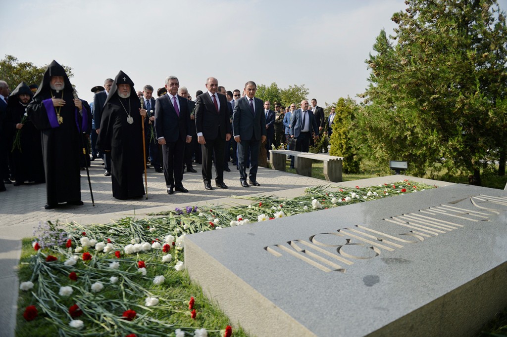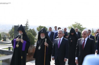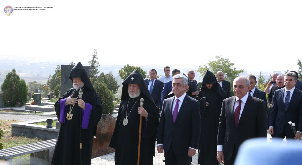 21 Սեպտեմբերի, 2017 17:28Հայաստանի Հանրապետության անկախության 26-րդ տարեդարձի առթիվ հանրապետության նախագահ Սերժ Սարգսյանը Արցախի Հանրապետության նախագահ Բակո Սահակյանի, Ն.Ս.Օ.Տ.Տ. Գարեգին Բ Ծայրագույն Պատրիարք և Ամենայն Հայոց Կաթողիկոսի, Մեծի Տանն Կիլիկիո Կաթողիկոս Ն.Ս.Օ.Տ.Տ. Արամ Առաջինի հետ և Հանրապետության բարձրագույն ղեկավարության ու ՊՆ, ԶՈՒ և ԶՈՒ ԳՇ ղեկավար կազմի ուղեկցությամբ սեպտեմբերի 21-ին այցելել է «Եռաբլուր» զինվորական պանթեոն, հարգանքի տուրք մատուցել իրենց կյանքը Հայրենիքի անկախության համար զոհաբերած հայորդիների հիշատակին:
