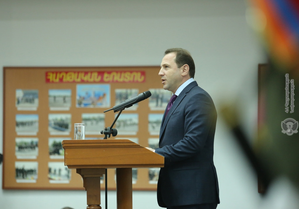 Թույլ տվեք ասել, որ մարդկության պատմության առաջին օրերից մինչև այսօր հենց անվտանգության կարիքներն են, հենց ռազմական գործն է քաղաքակրթության զարգացման ամենամեծ խթանը: Այսօր բազմաթիվ տեխնոլոգիական նորամուծություններ՝ որպես ամենօրյա գործիք, որ օգտագործում ենք կենցաղում, նրանք ի սկզբանե ստեղծվել են որպես ռազմական գործիք, անվտանգության անբաժանելի մաս: Եվ ես կարծում եմ, որ այս փուլում, երբ ՀՀ Զինված Ուժերը սպառազինության և տեխնիկայի զարգացման, մարտունակության զարգացման բոլորովին նոր փուլ են թևակոխել, ինտելեկտուալ աշխատանքը պետք է դառնա մեր ԶՈՒ զարգացման կարևորագույն առանձնահատկություններից մեկը: Երբ ասում ենք, որ ՀՀ Զինված Ուժերը, Հայոց բանակը պետք է լինեն մարտունակ միջազգային ամենաբարձր ստանդարտներով, առաջին հերթին նկատի ունենք, որ ՀՀ բանակը պետք է մարտունակ լինի ինտելեկտուալ առումով, նկատի ունենք, որ Հայոց բանակը պետք է լինի աշխարհի ամենաինտելեկտուալներից մեկը: